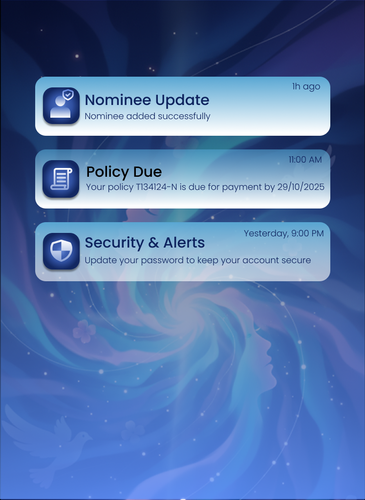 Your data, your alerts all in one place. Get notified about policy dues, nominee changes, and more. LegacySetu makes sure you never skip what matters. Stay updated, informed, and worry-free.